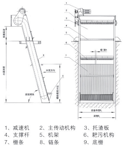 回转式格栅主要由机架、牵引链、传动系统、齿耙组合、主栅、底栅、水下导轮组合等部件组成。