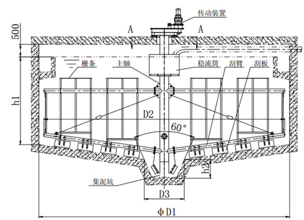 刮臂在传动装置带动下绕池中心轴线旋转, 刮臂上的刮板将沉积在池底的污泥由外向内推向池心集泥坑当运行过程中,由于刮板、刮臂受异物卡塞或积泥过多等意外原因导致传动过扭,在其扭矩达到设定值时,过扭保护机构动作,切断电源,自动报警停机。