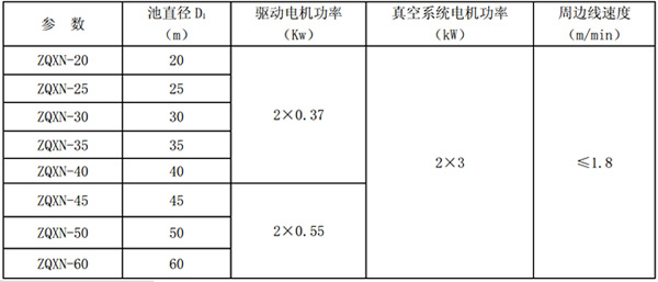 ZQXN 型周边传动全桥式吸泥机用于污水处理厂圆形二沉池,将沉降在池底的污泥刮集至一组沿半径方向布置的吸泥管管口,再通过中心排泥管排出,以便污泥回流或浓缩脱水,同时将池面的浮渣撇向集渣斗,通过集渣斗排出池外,以便进一步处理。