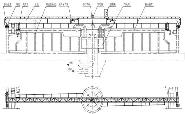 主梁在驱动装置带动下,绕池中心轴线旋转,将沉积在池底的污泥由刮泥板刮集至各吸泥口,在液位的作用下,污泥经吸泥口,输泥槽、虹吸管、中心泥罐、中心排泥管排至污泥坑。每个吸泥管上端设有调节器,以调节各吸泥管的流量分配。同时,液面上的浮渣向随主梁旋转的撇渣板和周边浮渣挡板形成的渐缩区域内集中,直至其封闭边—刮渣摆臂。当摆臂抵达集渣斗时,由摆臂上的刮渣板刮集至集渣斗排出池外。